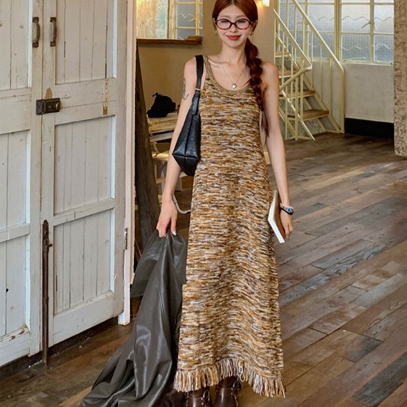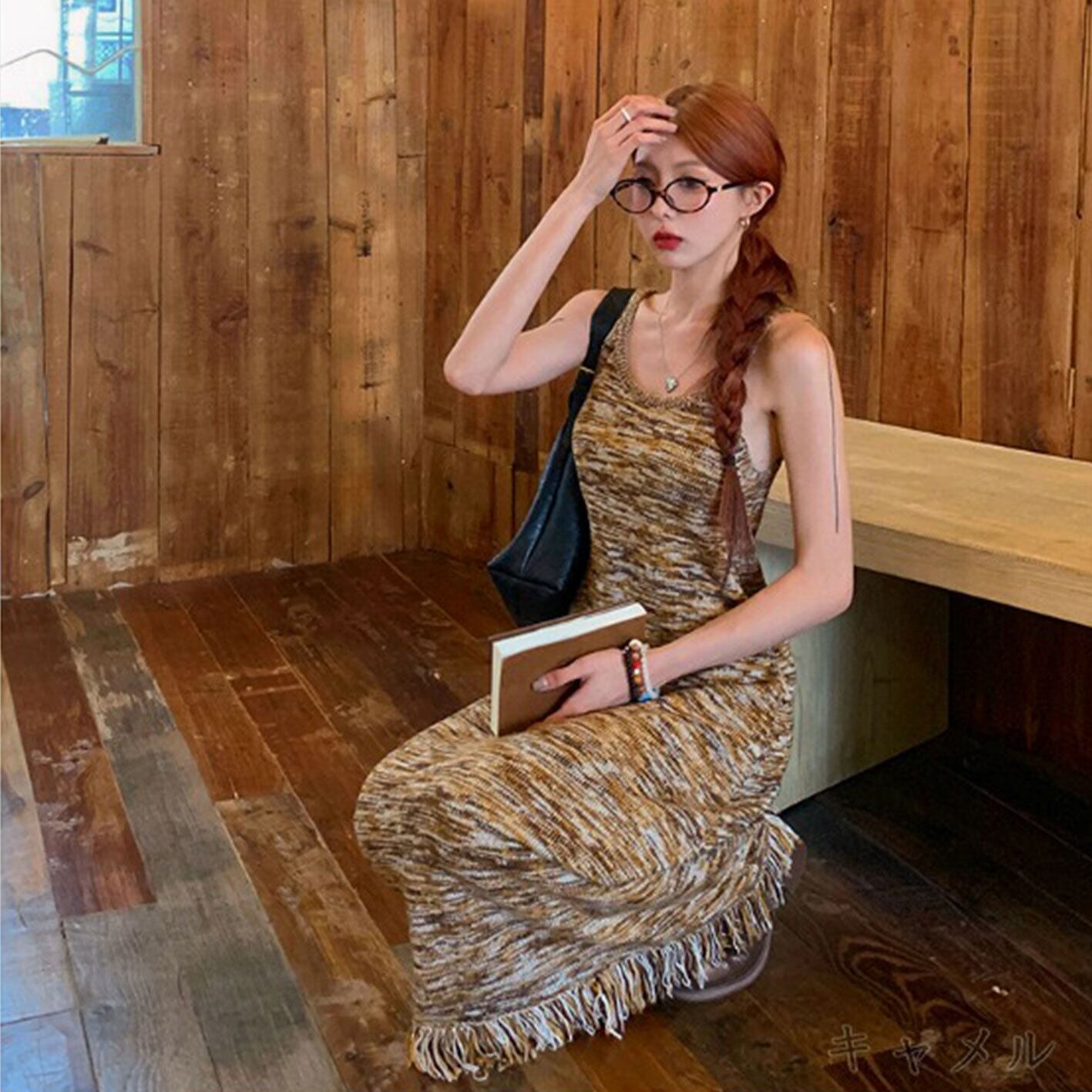 キャミソールワンピース フリンジ フリル 切り替え スリム 着痩せ カジュアル トップス アウター ボトムス レディース ワンピース 春 夏 半袖 長袖 きれいめ ロング 可愛い かわいい 膝丈 ひざ丈 20代 30代 40代 マキシ タイト レトロ モダン 白 黒 2024 RB-R7-02-NS-SA-086