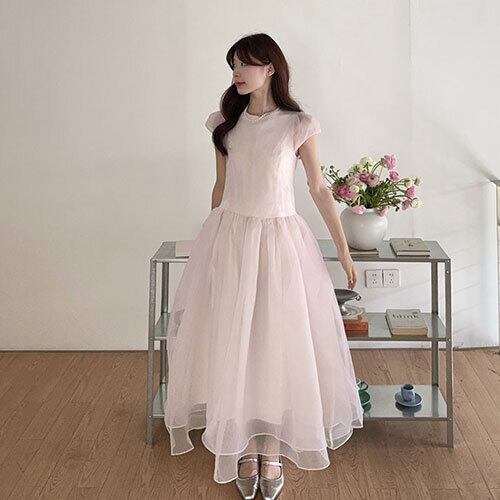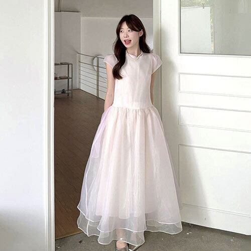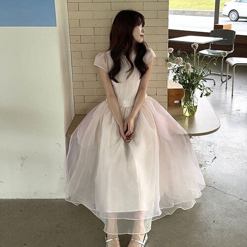 2025年INS 夏新作 韓国風 気質 おしゃれ オルガンザ パフスリーブ ロング ワンピース トップス アウター ボトムス レディース ワンピース 春 夏 半袖 長袖 きれいめ ロング 可愛い かわいい 膝丈 ひざ丈 20代 30代 40代 マキシ タイト レトロ モダン 白 黒 2024 RB-R7-09-NS-SA-023
