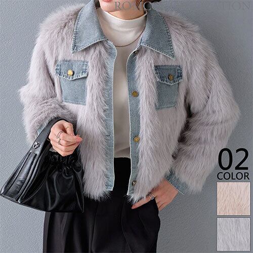 デニム切り替え フェイクファー ジャケット トップス アウター ボトムス レディース ワンピース 春 夏 半袖 長袖 きれいめ ロング 可愛い かわいい 膝丈 ひざ丈 20代 30代 40代 マキシ タイト レトロ モダン 白 黒 2024 RB-R7-12-NS-SA-053