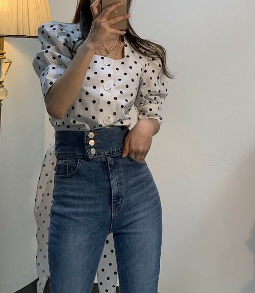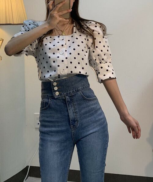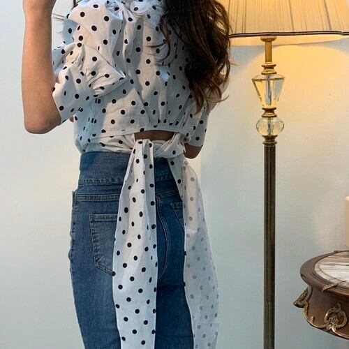 バックリボン ドット ブラウス スクエアカラー パフスリーブ トレンド オルチャン ミディアム お出かけ 2色