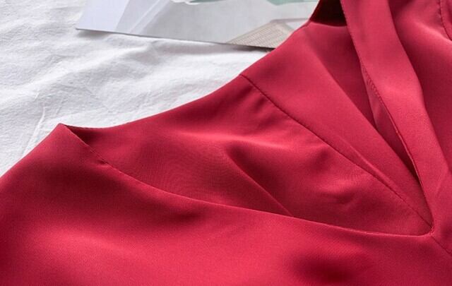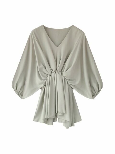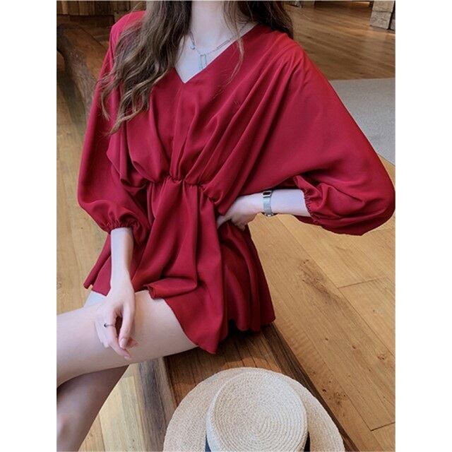 キレイめ シャツ シフォン Vネック 7分袖 ボリューム袖 無地 体型カバー ウエストゴム 大人可愛い