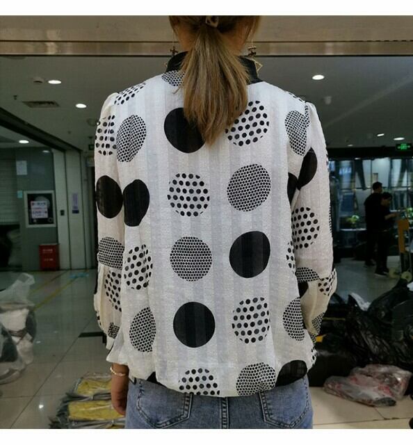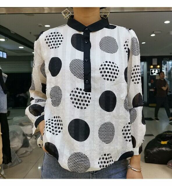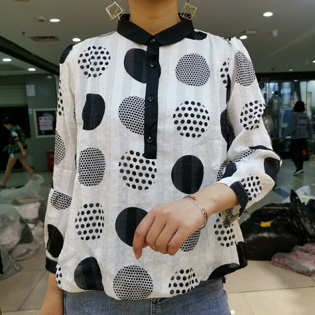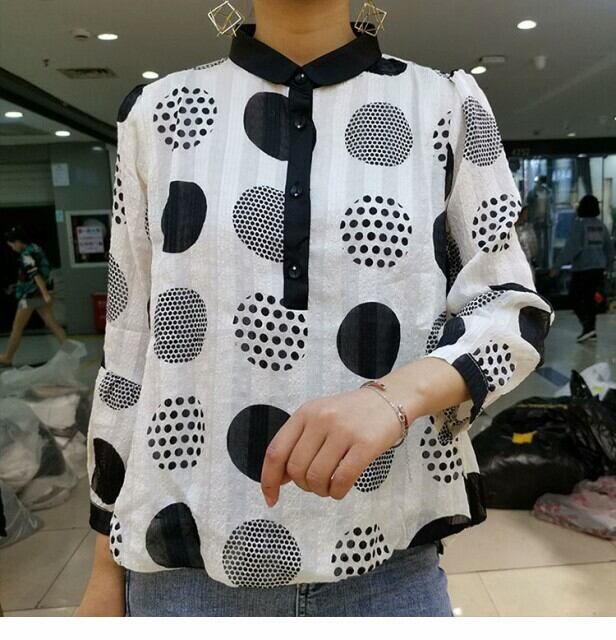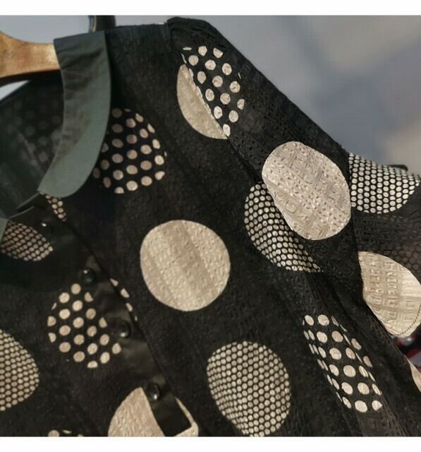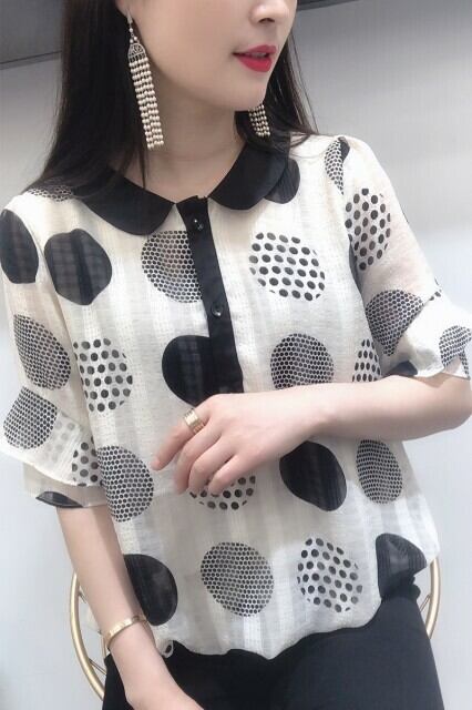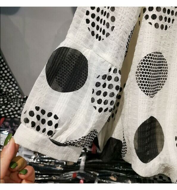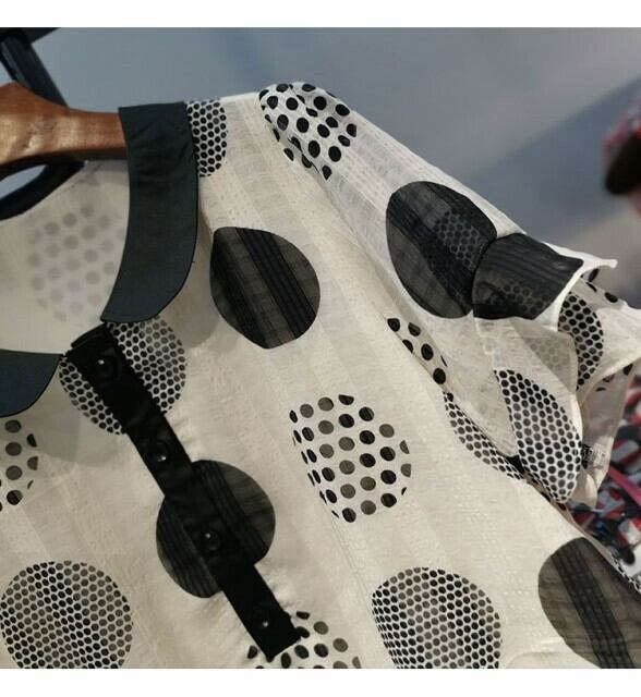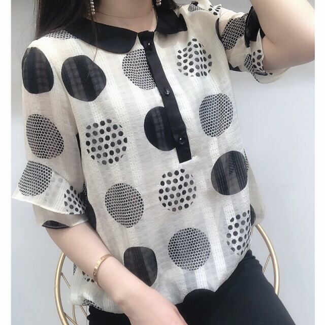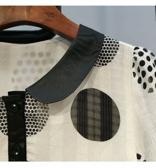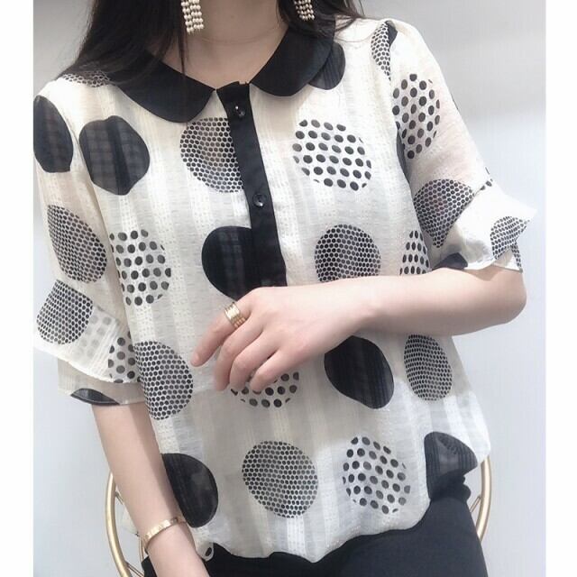 水玉 シャツ ローカラー 七分袖 フレア袖 ドット柄 スリムフィット ボタン トレンド デート お出かけ