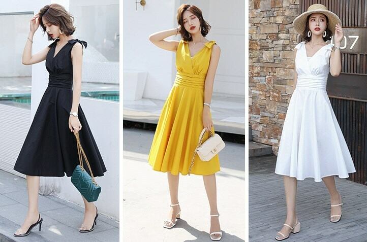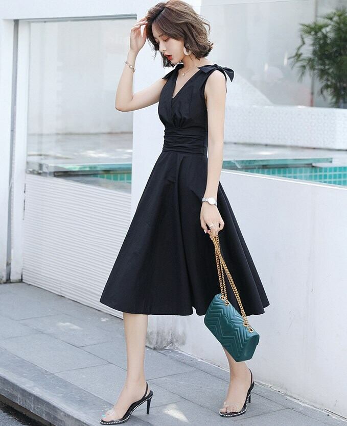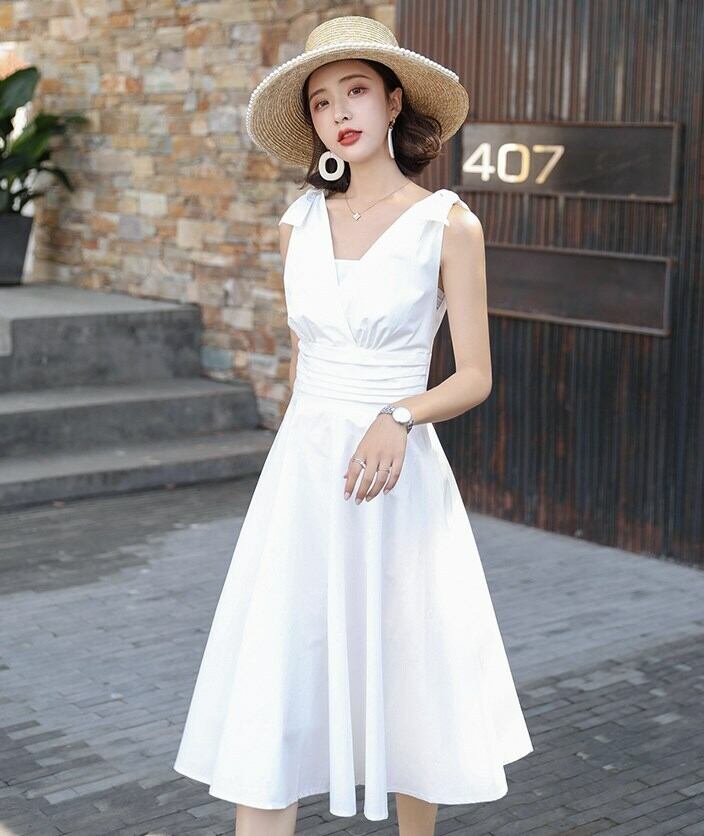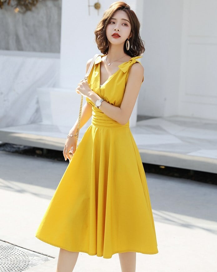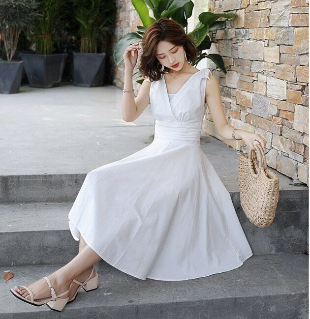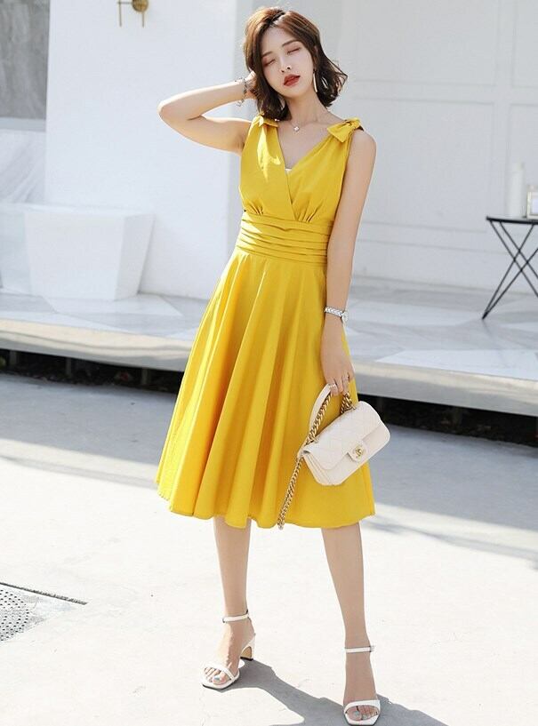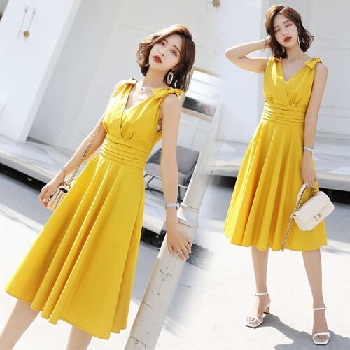 ワンピース ノースリーブ ミッドウエスト Vネック 大スウィングタイプ ロータスリーフ ビーチ