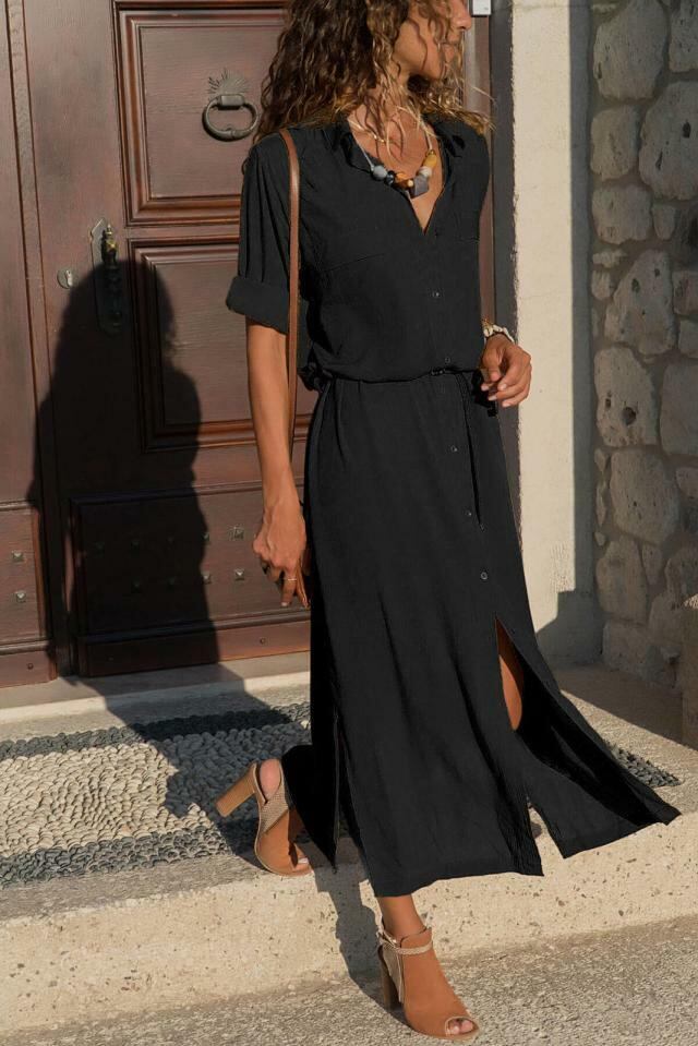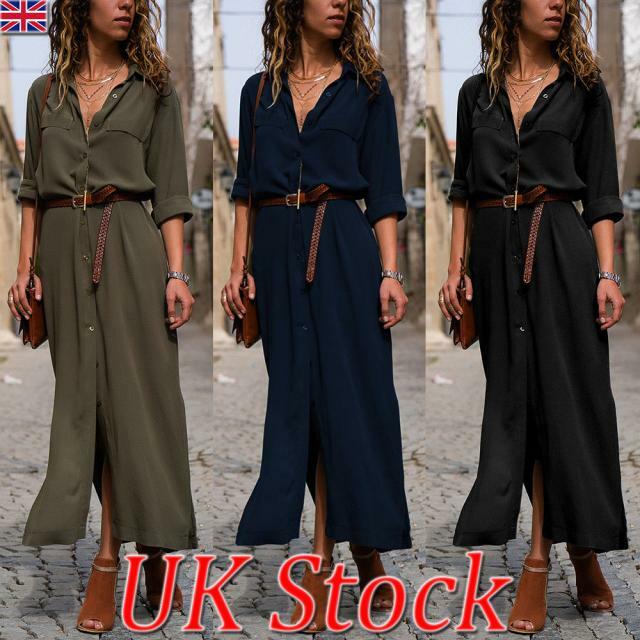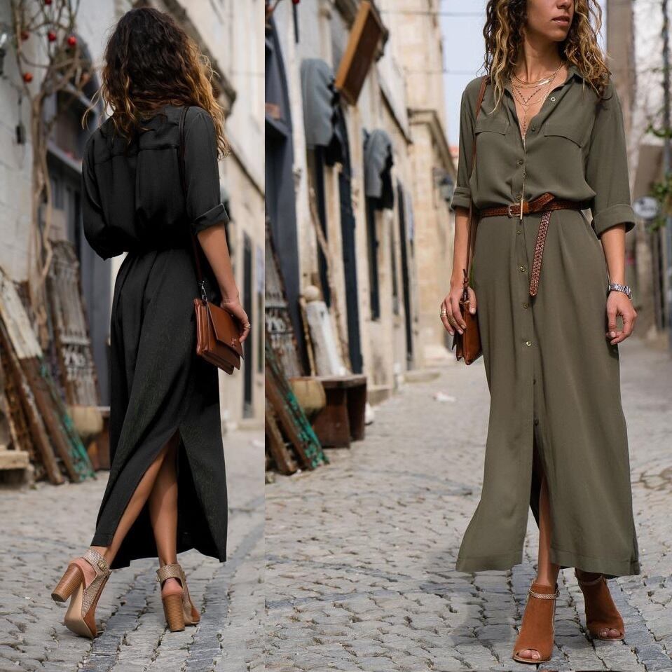 ワンピース 欧米風 長袖 スプリット ロングドレス ミドルウエスト シングルブレスト 無地 楽ちん