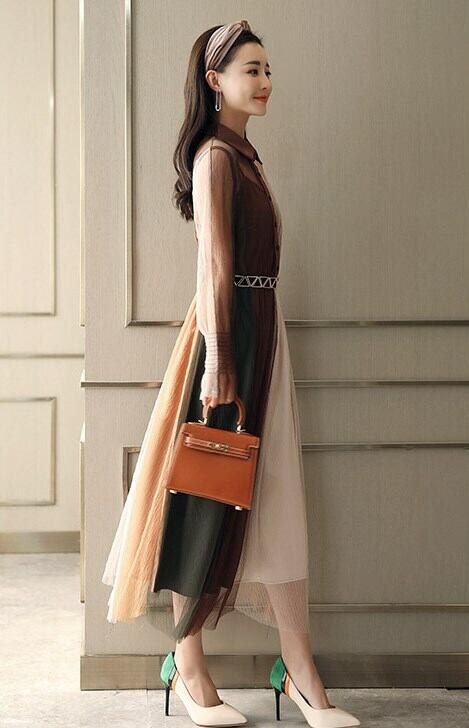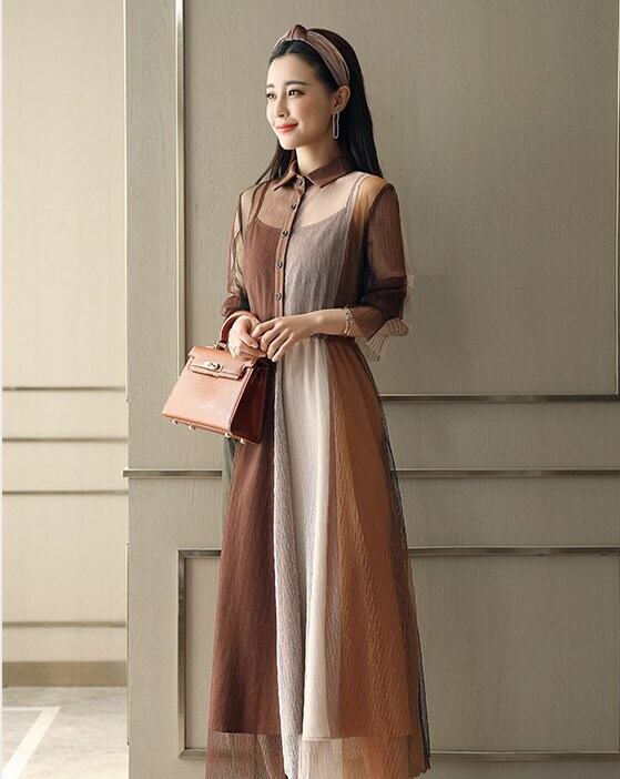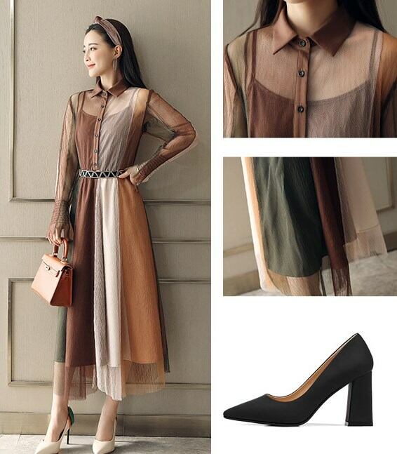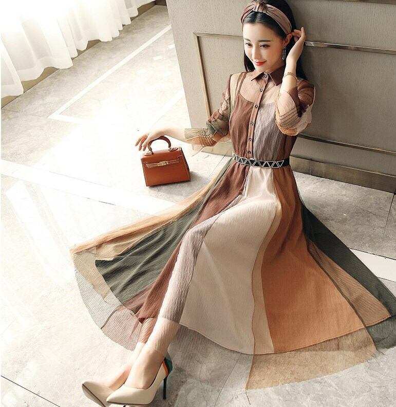ワンピース ニッチ シフォン ドレス メッシュ スリング シングルブレスト ミドルウエスト 大スイングタイプ