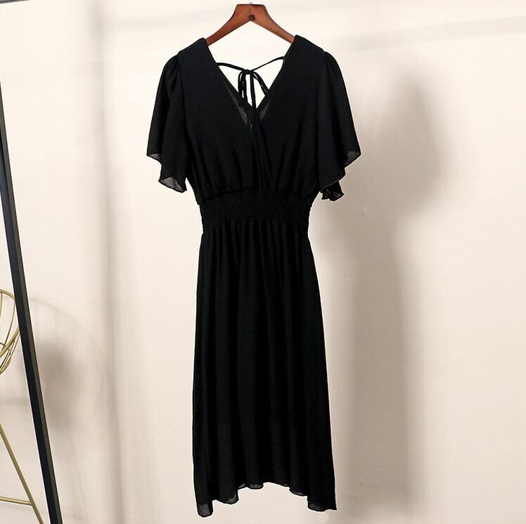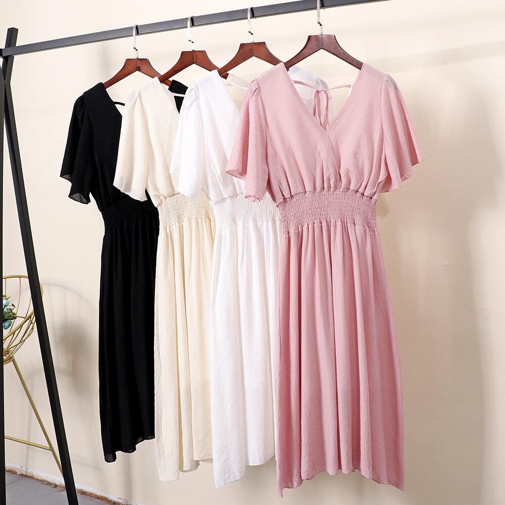 ワンピース ドレス 半袖 ホワイト ブラック アプリコット ピンク ハイウエスト ミディアム丈 フライングスリーブ