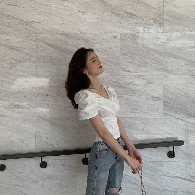ブラウス 半袖 パフスリーブ ボリューム袖 クロスデザイン ショート丈 スリム 無地 チェック柄 セクシー 夏 RB-A06-0001