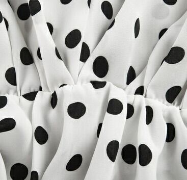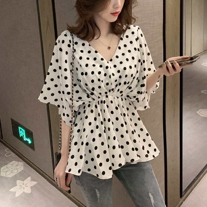 ドット柄 シフォン ブラウス Vネック ドルマンスリーブ ワイドスリーブ 5分袖 ウエストゴム 水玉 モノトーン カジュアル ガーリー 大人かわいい お出かけ デート 春 夏 RB-A06-0008