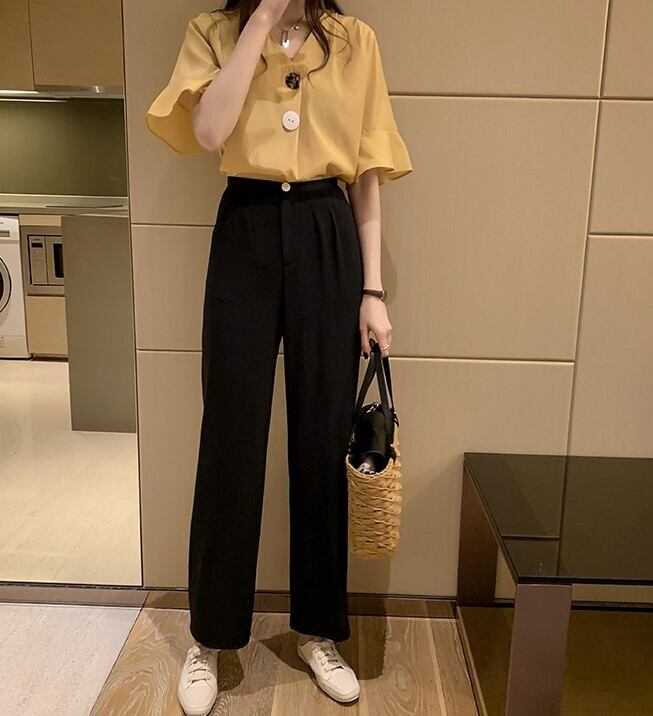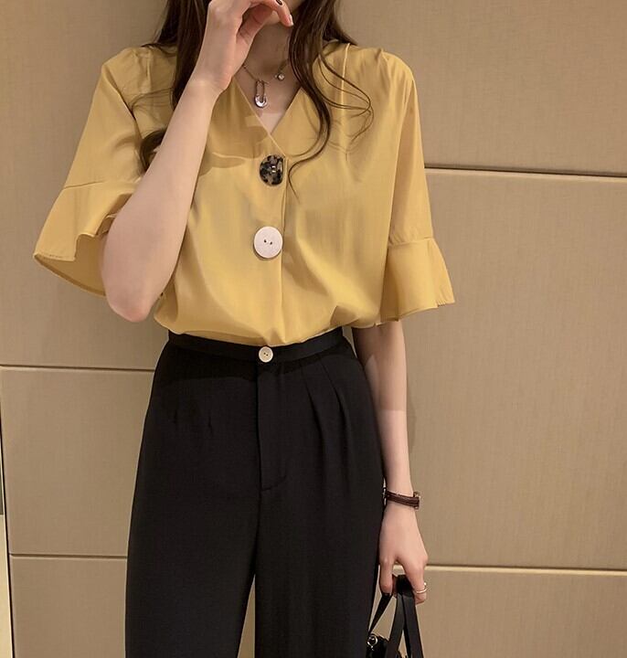 シフォン ブラウス プルオーバー 半袖 Vネック ホーンスリーブ フレアスリーブ 飾りボタン 無地 薄手 落ち感 柔らか きれいめ フェミニン 通勤 オフィス 大きいサイズ RB-A06-0009