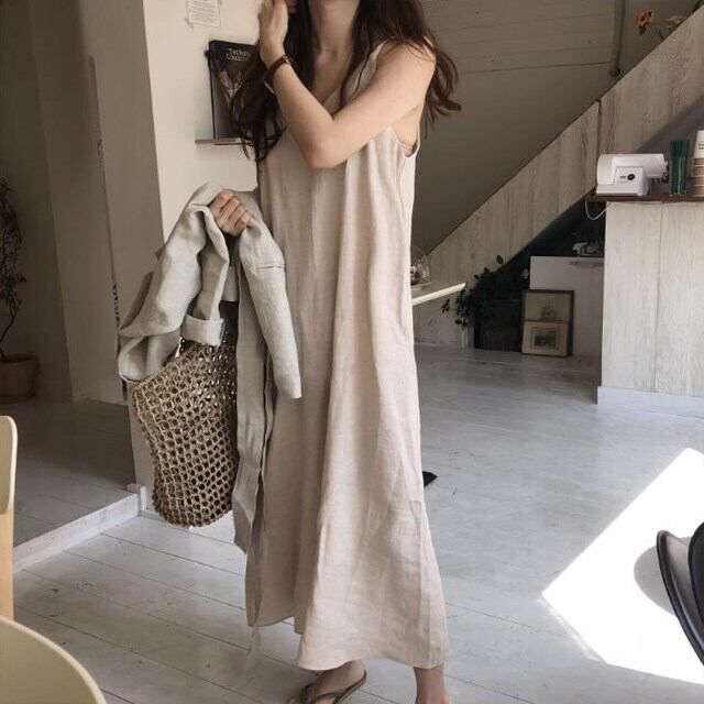 韓国風 ノースリーブワンピース キャミソール Vネック ロング丈 リネン カジュアル シンプル 無地 RB-M06-0001
