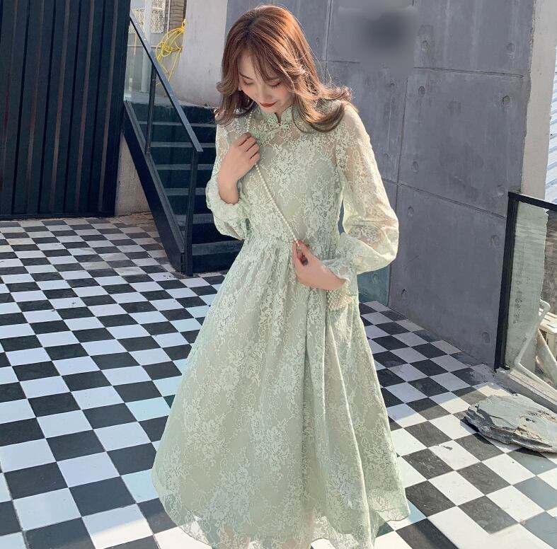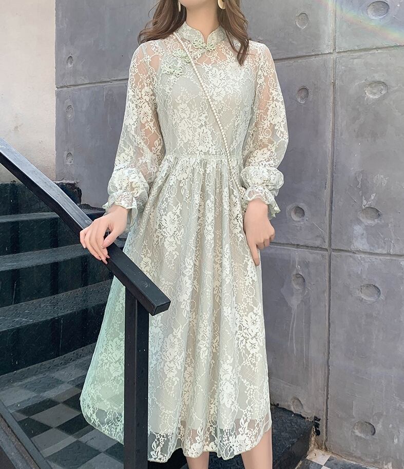 ドレス ワンピース 長袖 ひざ丈 薄手 透け感 レース 花柄 パーティー フレアスカート RB-M06-0014