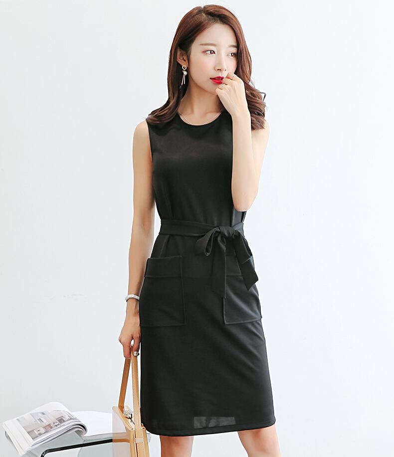 韓国風 ワンピース ノースリーブ 丸首 ラウンドネック ひざ上 リボン キレイめ 大人 シンプル 上品 パーティー RB-M06-0016