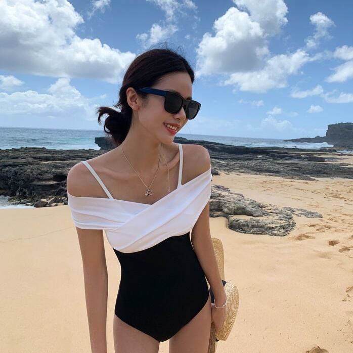 ワンピース水着 オフショルダー モノトーン バイカラー 体型カバー シンプル きれいめ セクシー 大人カジュアル 夏 ビーチ 海 プール リゾート RB-I06-0010