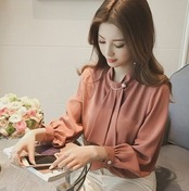 胸元パール ボウタイブラウス 長袖 シフォン ブラウス 無地 エレガント フェミニン きれいめ 通勤 オフィス お呼ばれ フォーマル 春 夏 RB-A06-0013