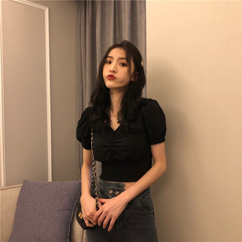 ショート丈 Vネック パフスリーブ ブラウス シャツ トップス ギャザー バストアップ 無地 カジュアル ガーリー セクシー お出かけ デート 夏 RB-A06-0018