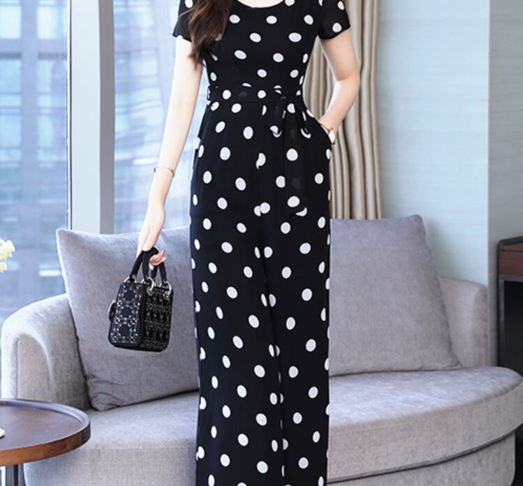 コンビネゾン ジャンプスーツ ドット柄 ラウンドネック 半袖 ガーリー ゆったりサイズも 春 夏 RB-Y06-0007