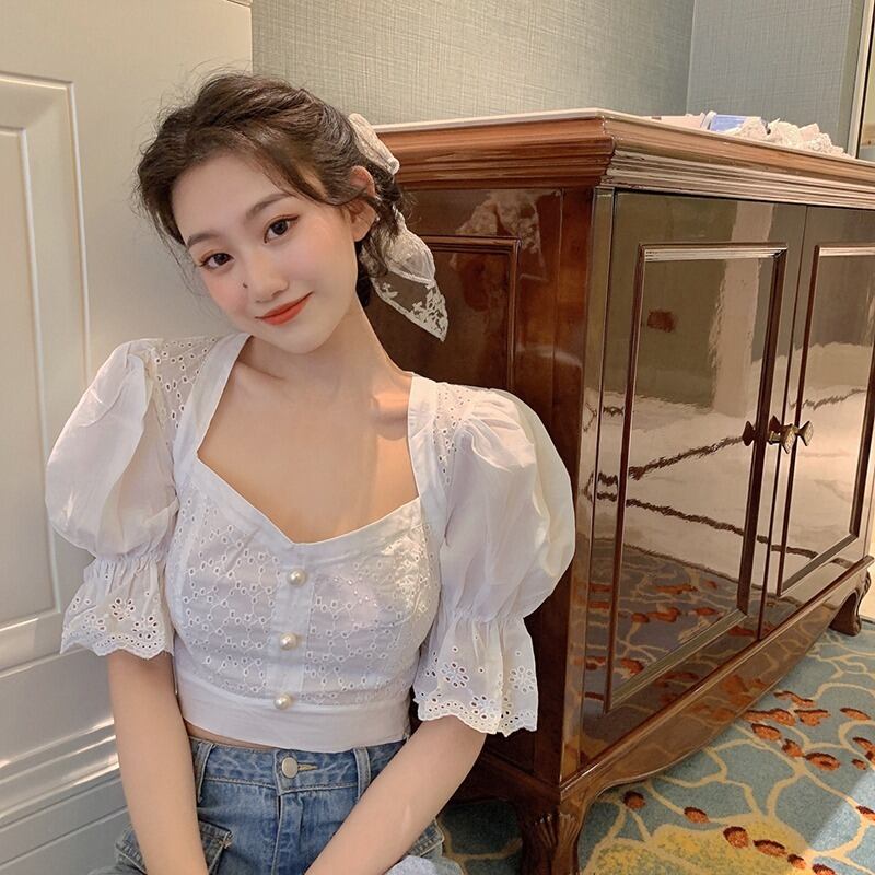 ブラウス 半袖 パフスリーブ ボリューム袖 ハートネック カットワークレース パンチングレース ショート丈 バックシャーリング セクシー ガーリー ラブリー 甘トップス プリンセス お出かけ デート 夏 RB-A06-0031