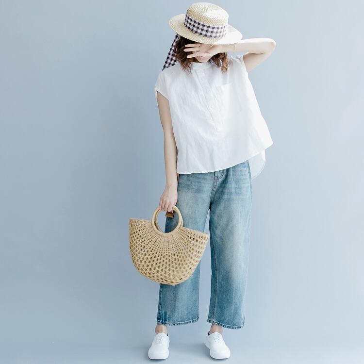 韓国風 コットンリネン バンドカラー シャツ フレンチスリーブ 半袖 ハーフボタン サイドスリット 綿麻 通気性 吸水性 さわやか 無地 シンプル カジュアル ナチュラル デイリー 着回し ゆったり 夏 RB-A06-0045