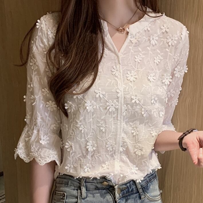 韓国風 ブラウス 5分袖 刺繍 レース 花柄モチーフ Vネック スキッパー 透け感 薄手 白シャツ 清楚 ガーリー 清潔感 大人かわいい 通勤 お出かけ デート デイリー 春 夏 RB-A06-0047