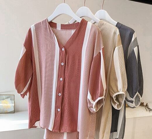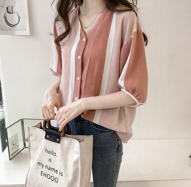 韓国風 ブラウス シャツ 5分袖 ストライプ柄 ボリューム袖 Vネック ゆったり 細見え 体型カバー カジュアル お出かけ 通勤 オフィス 春 夏 RB-A06-0048