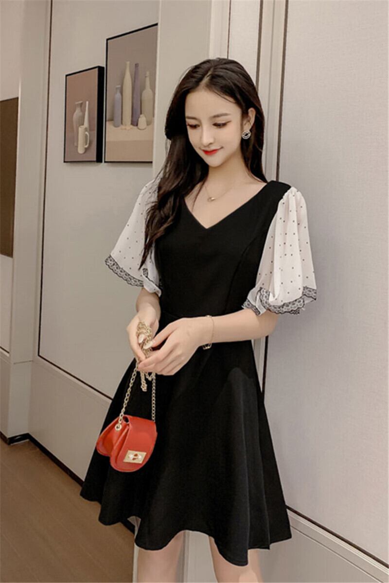 半袖 ドット柄 透け感 大人可愛い ふんわり Vネック 体型カバー 落ち着き ゆったり 膝丈ワンピース RB-K06-0001