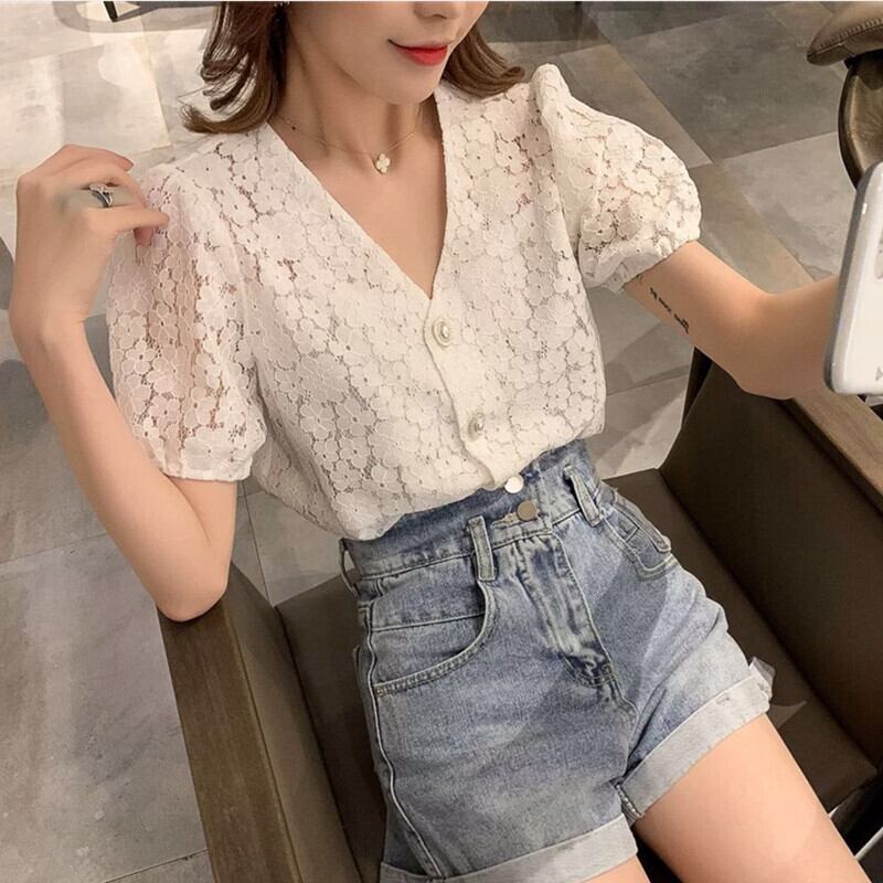 韓国風 ブラウス 総レース Vネック 半袖 パフスリーブ 花柄 レース 透かし模様 キャミソール付き レトロ ガーリー sweet 甘トップス きれいめ かわいい 清楚 春 夏 RB-A06-0053
