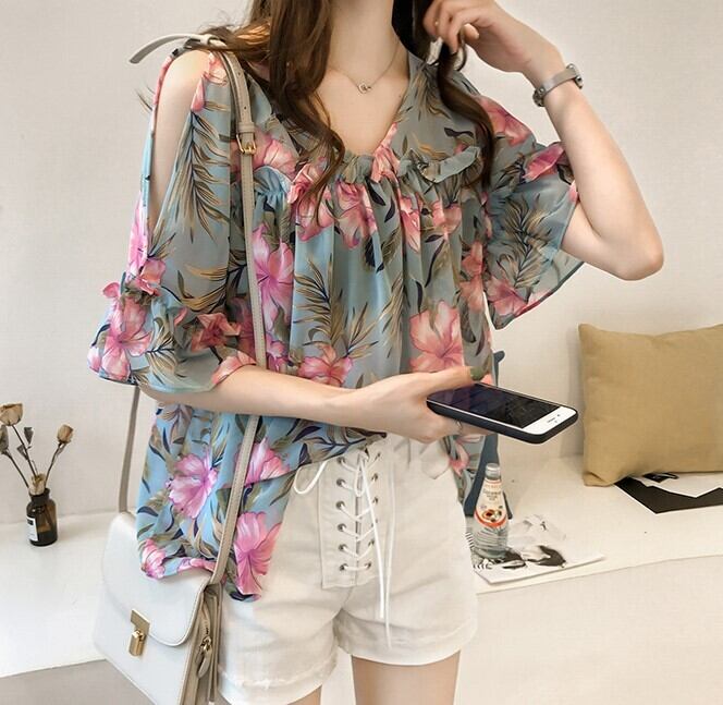 ブラウス 花柄 半袖 シフォン Vネック カットショルダー 肩出し 肌見せ 薄手 柔らか 透け感 シアー エレガント フェミニン 華やか お出かけ デート レジャー リゾート 春 夏 RB-A06-0054