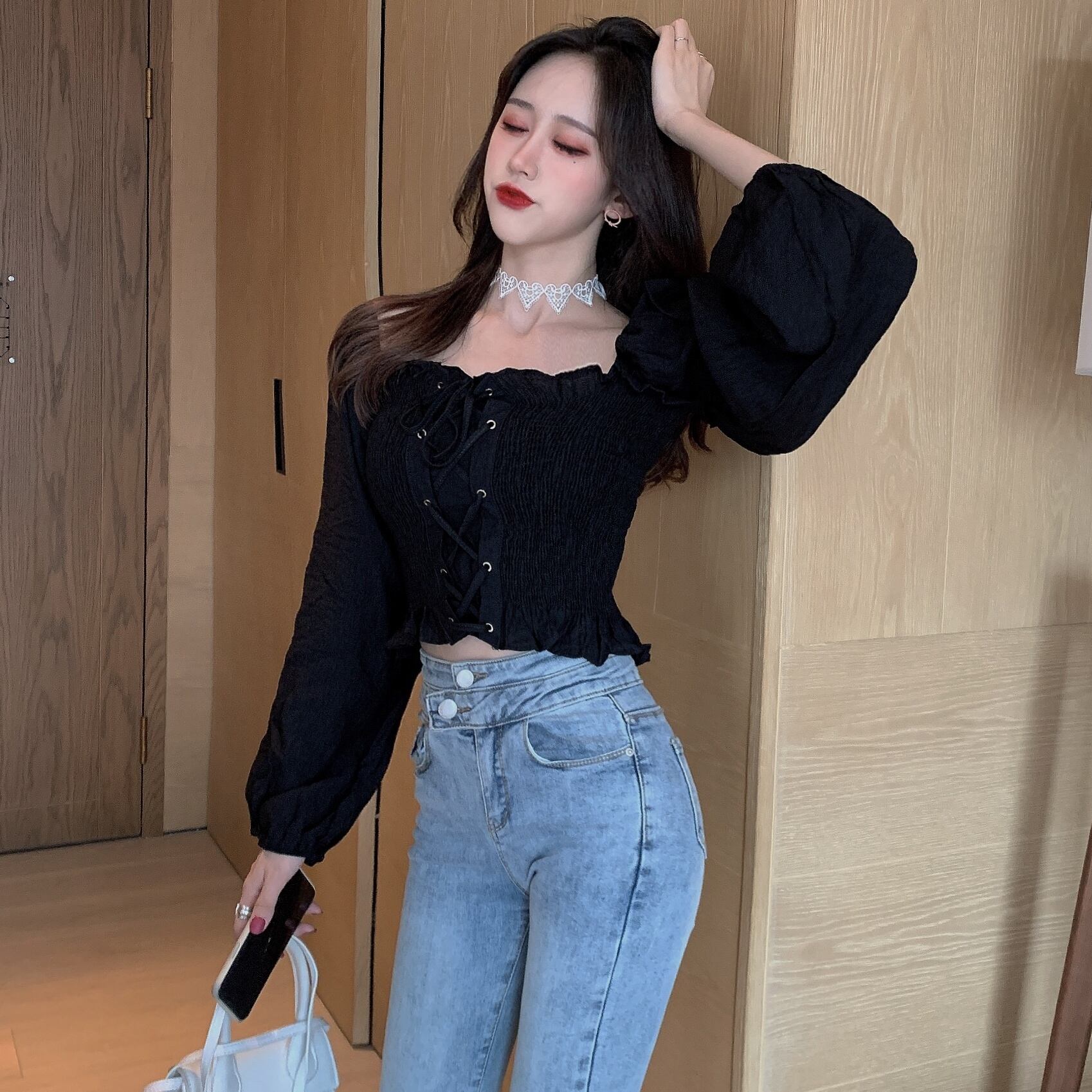 ブラウス トップス オフショルダー 長袖 レースアップ 編み上げ リボン シャーリング ボリューム袖 肌見せ 肩出し スリム ショート丈 無地 セクシー かわいい カジュアル 春 夏 RB-A06-0065