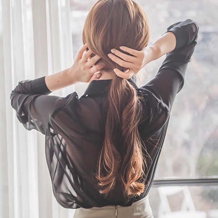シャツ トップス シフォン 長袖 シースルー シアー 透け感 無地 ブラック シンプル スタイリッシュ カッコいい セクシー 春 夏 RB-A06-0070