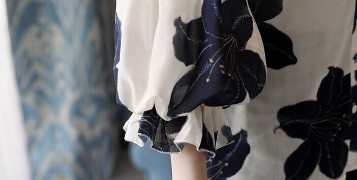 ブラウス 花柄 シフォン キーネック ランタンスリーブ ボリューム袖 7分袖 フラワープリント 華やか 上品 シック モダン きれいめ 通勤 デート お呼ばれ 春 夏 RB-A06-0075