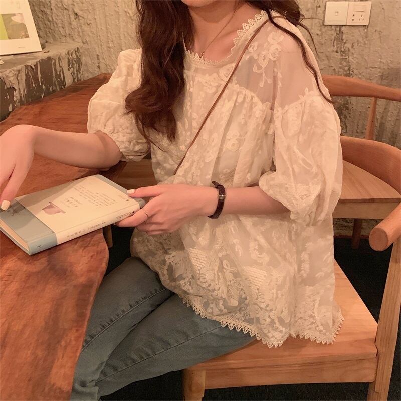 ブラウス 刺繍レース シフォン トップス ラウンドネック 5分袖 ボリューム袖 透け感 シースルー 甘トップス ガーリー かわいい 上品 デート お出かけ 春 夏 RB-A06-0078