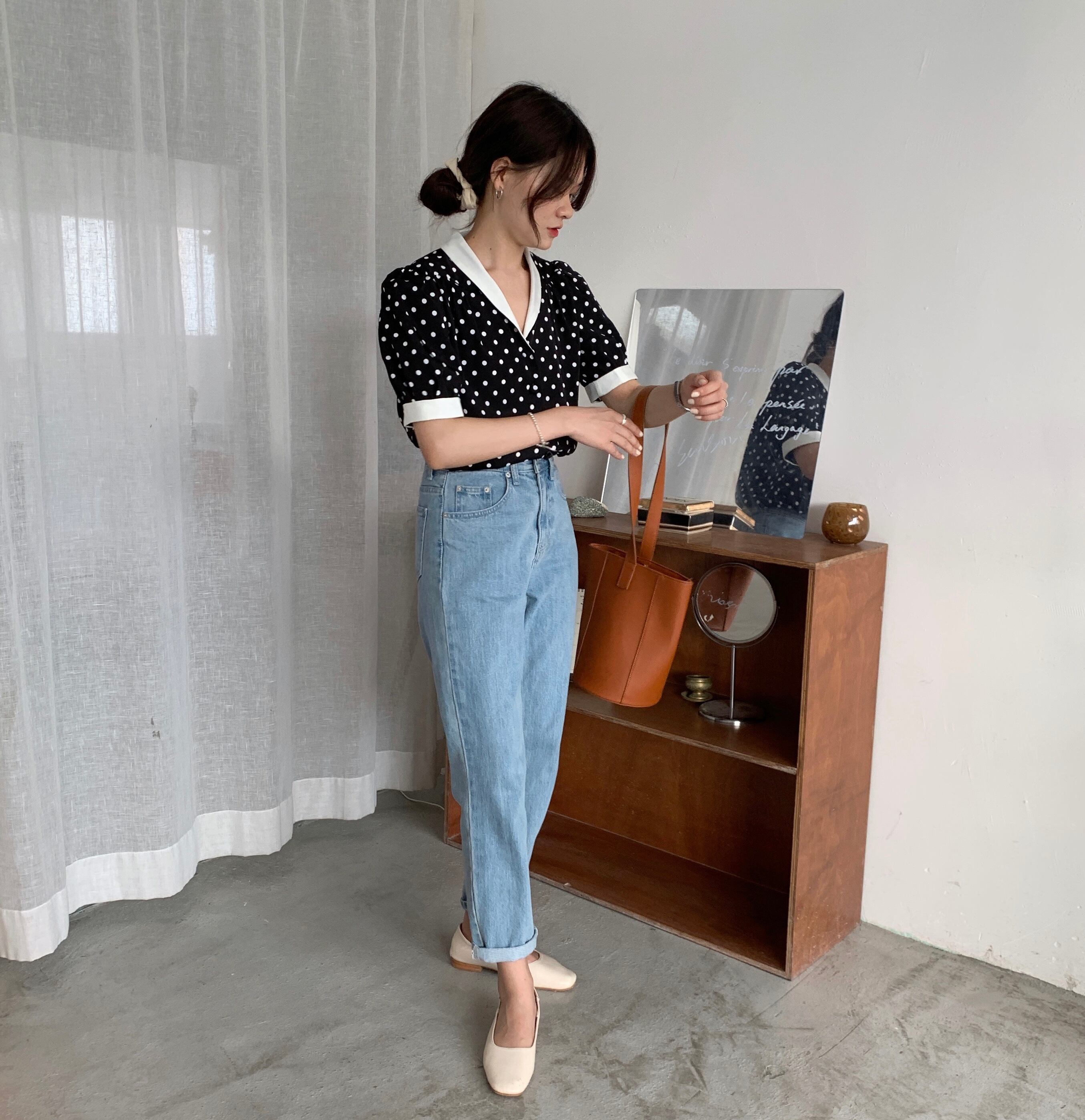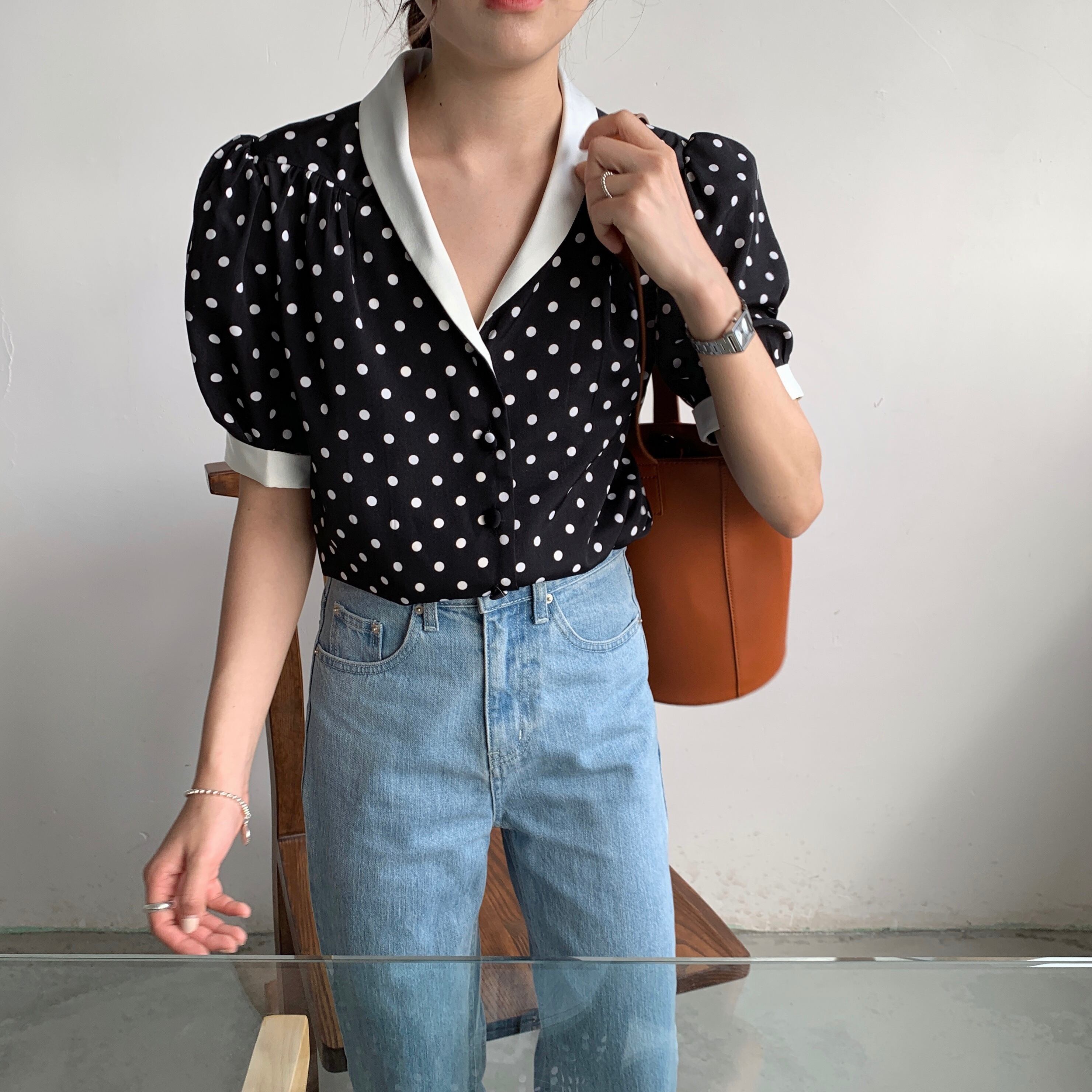 ドット柄 ブラウス 半袖 パフスリーブ ショールカラー モノトーン 水玉 カジュアル レトロ かわいい ガーリー 通勤 お出かけ 女子会 春 夏 RB-A06-0079