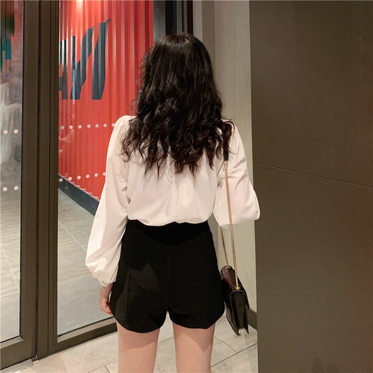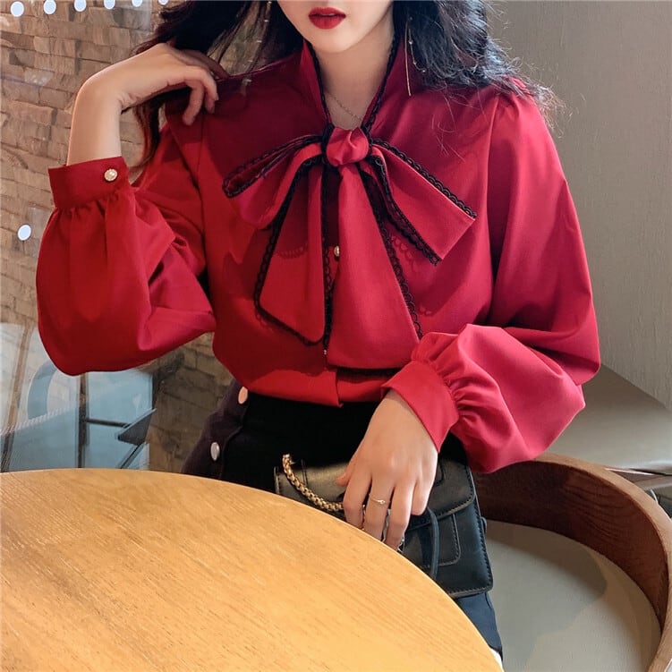 ブラウス ボウタイ リボン 縁取りレース 長袖 パフスリーブ トップス フェミニン きれいめ 女子力 通勤 オフィス デート RB-A06-0082