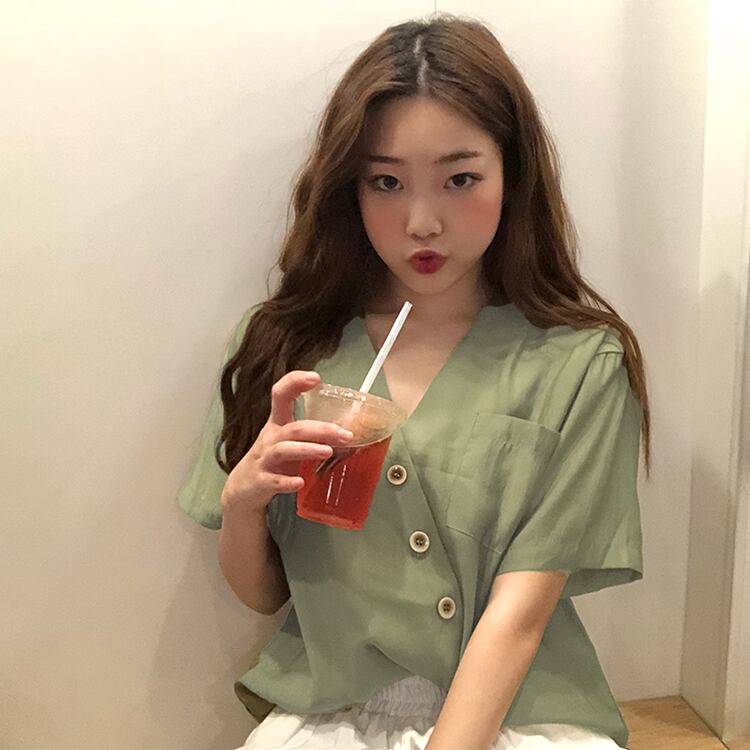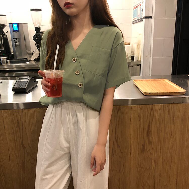 シャツ 半袖 Vネック ノーカラー アシンメトリー 斜めボタン 無地 シンプル スタイリッシュ カジュアル シック きれいめ 大人女子 通勤 オフィス デート 春 夏 RB-A06-0090