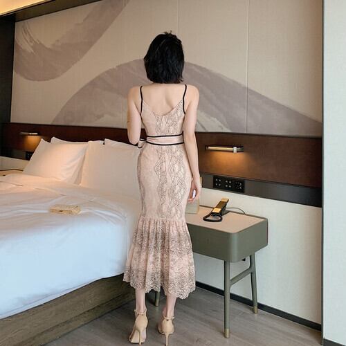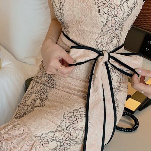 ワンピース キャミソール ノースリーブ ひざ下 ミモレ丈 フィッシュテール レース 花柄 リボン ウエスト RB-M06-0058