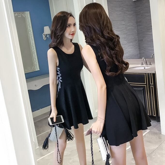 ワンピース サイド 編みこみリボン ひざ上 ミニ ショート ノースリーブ ラウンドネック フレアスカート RB-M06-0061