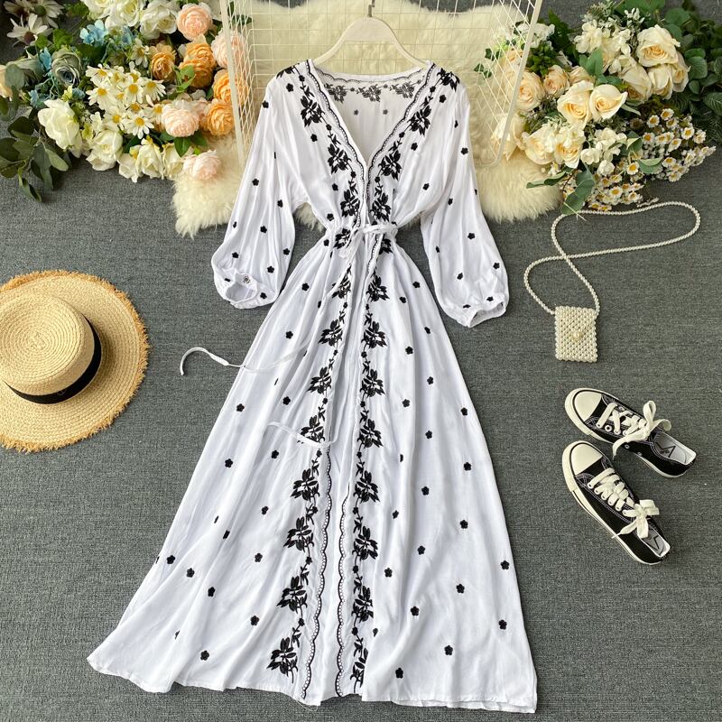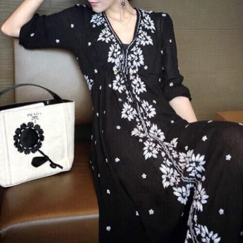 ワンピース ロング丈 花柄 シフォン ボヘミアン Aライン Vネック 7分丈 大人 可愛い RB-M06-0067