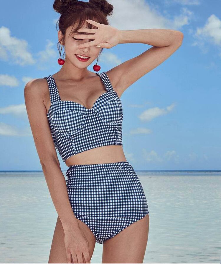 水着 ビキニ ビスチェ ハイウエスト ギンガムチェック ブルー 体型カバー レトロ ガーリー フェミニン 夏 ビーチ 海 プール リゾート RB-I06-0032