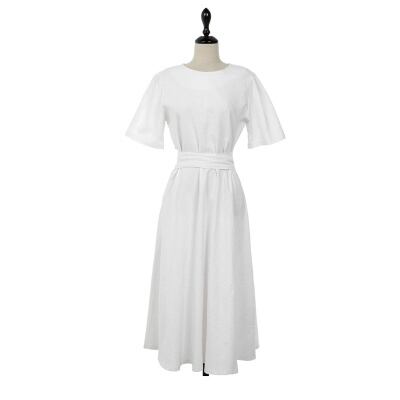 ワンピース 半袖 マタニティ ひざ下 ミモレ丈 春夏 シンプル 無地 ウエストマーク リボン ラウンドネック ゆったり フレアワンピース RB-S06-0013