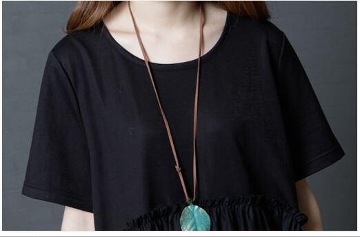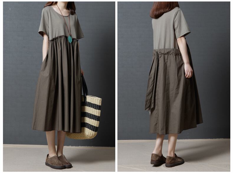 ワンピース ロング丈 ひざ下 半袖 ラウンドネック ハイウエスト フレア リネン ゆったり 大きいサイズ カジュアル RB-M06-0073