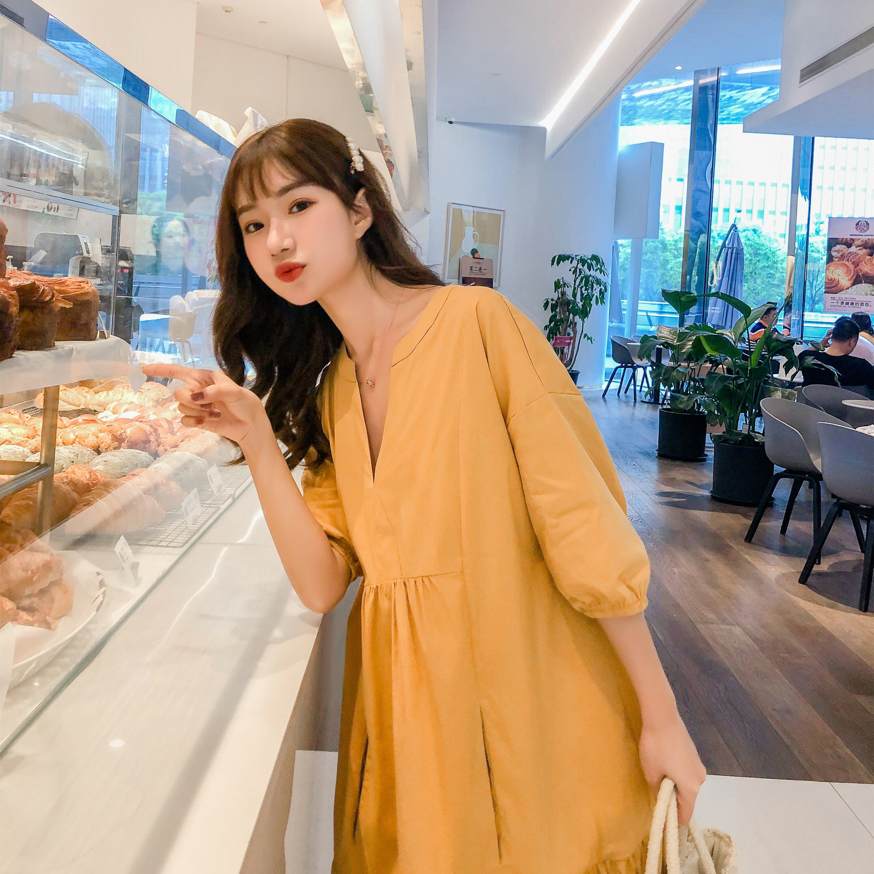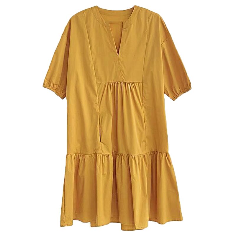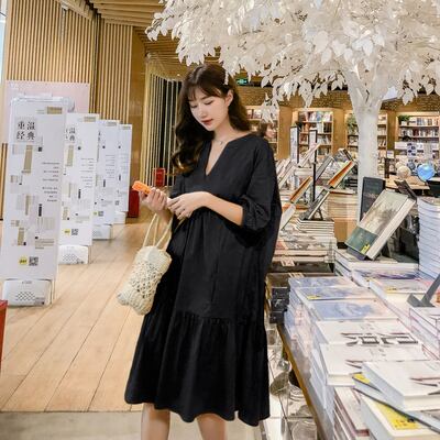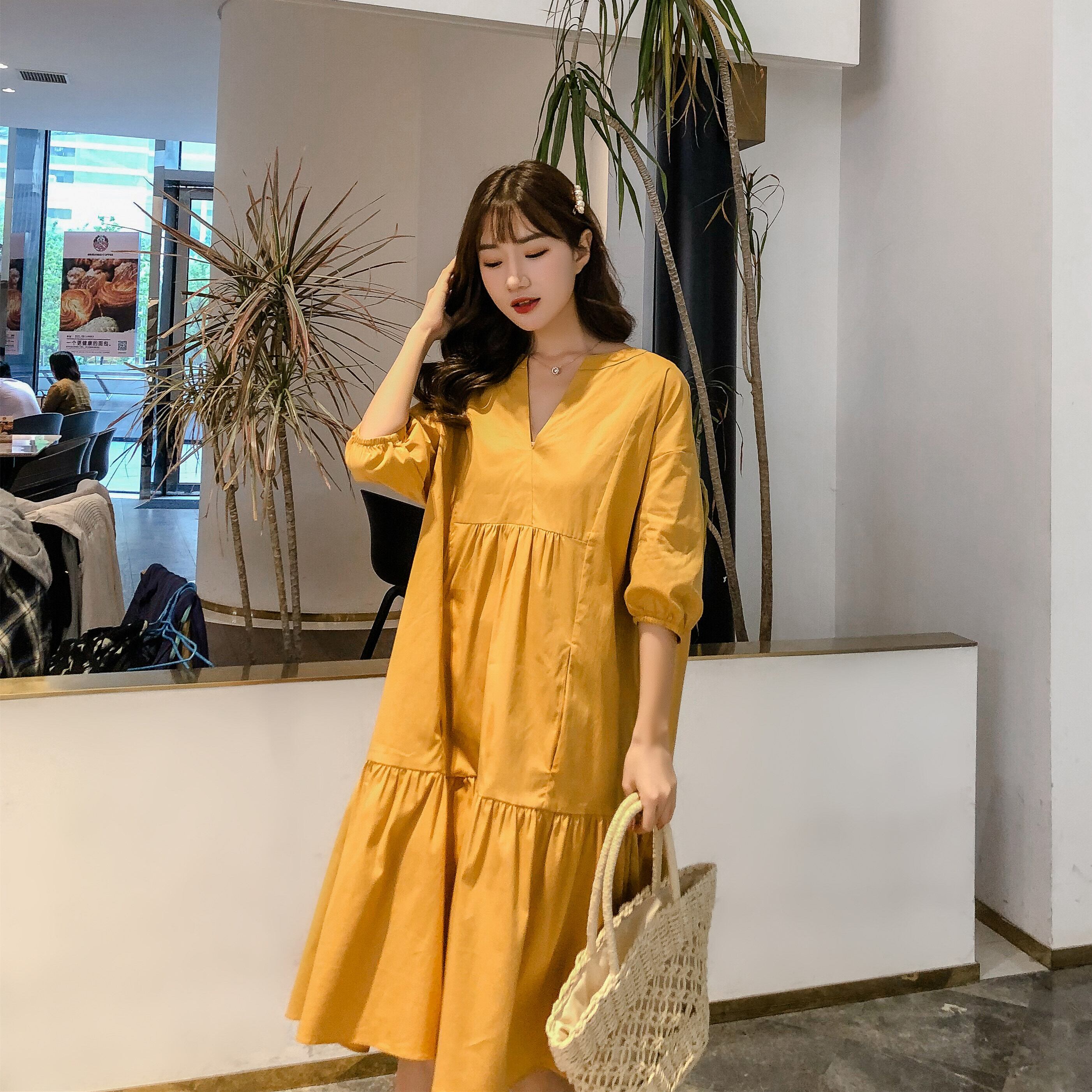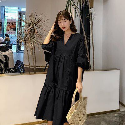 ワンピース Vネック 五分袖 マタニティ 産前産後 春夏 ひざ丈 シンプル 無地 ガーリー 裾フレア フレア RB-S06-0015
