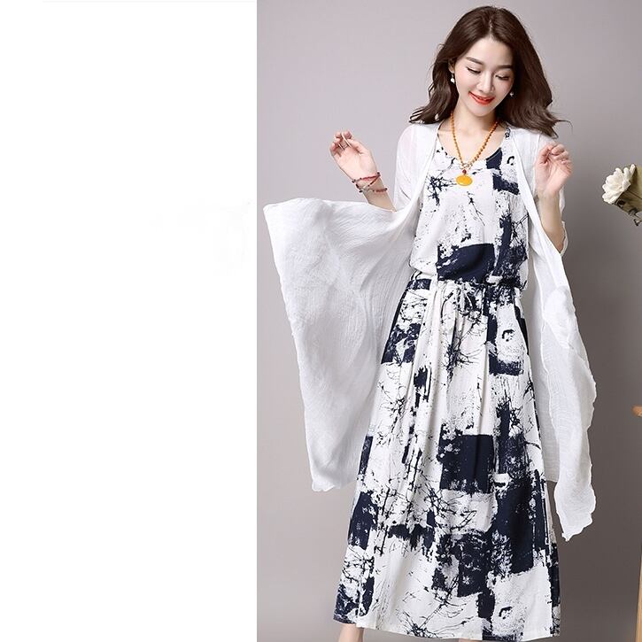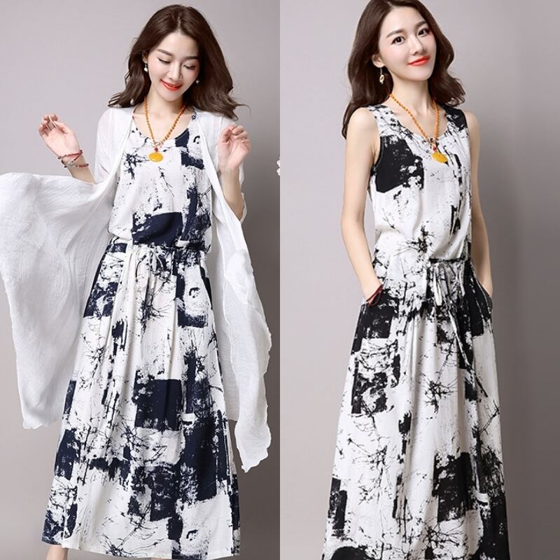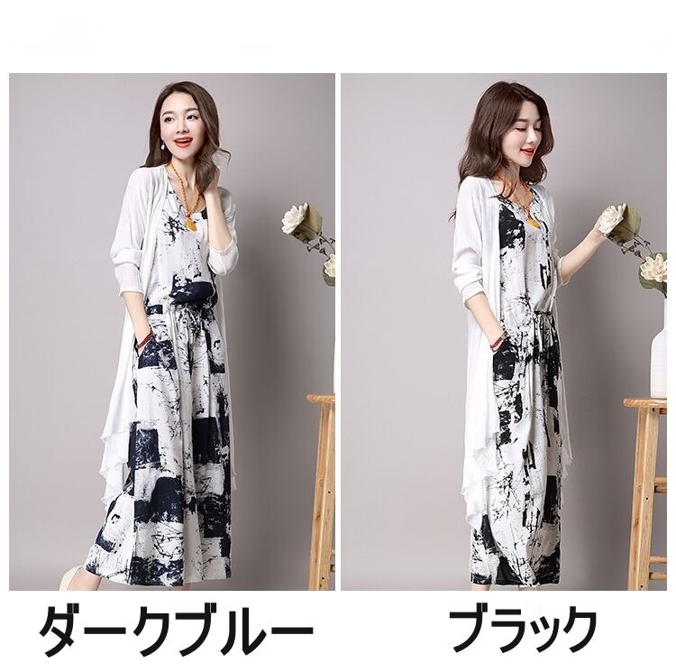 ワンピース ノースリーブ ラウンドネック ロング丈 ペイント柄 大人 カジュアル リネン 大きいサイズ ゆったり RB-M06-0074