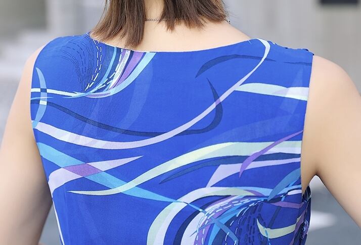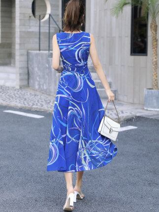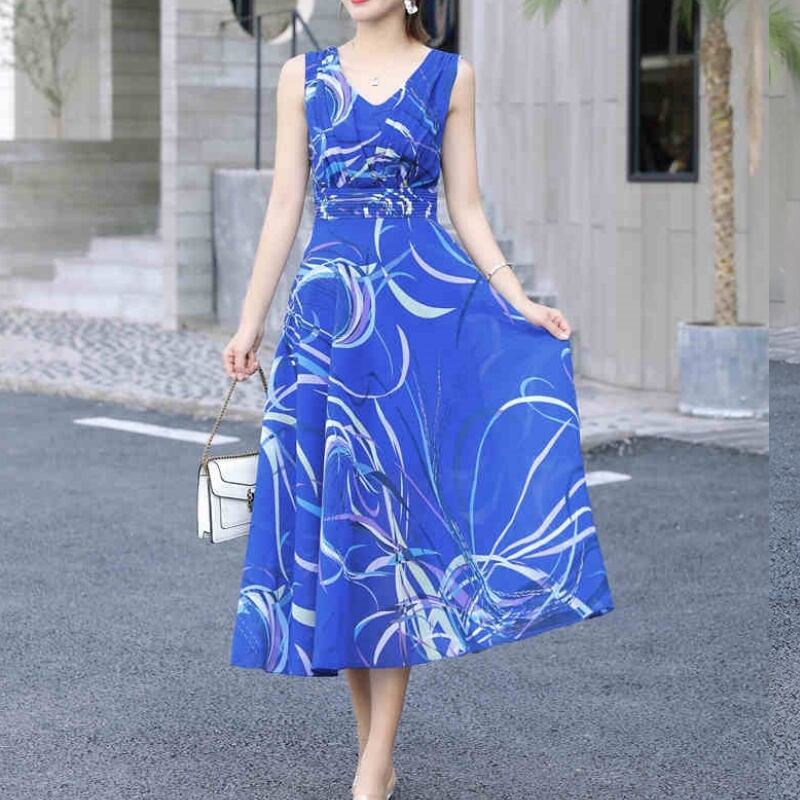 ワンピース ノースリーブ Vネック ハイウエスト Aライン ひざ下 ロング丈 花火 曲線 RB-M06-0085