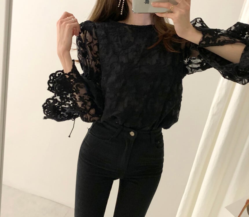 ブラウス トップス 花柄 メッシュレース 長袖 キャンディスリーブ カットアウト リボン 透け感 シアー シースルー 甘トップス バックシャン 袖コンシャス ガーリー 大人かわいい お出かけ 女子会 春 夏 RB-A06-0103
