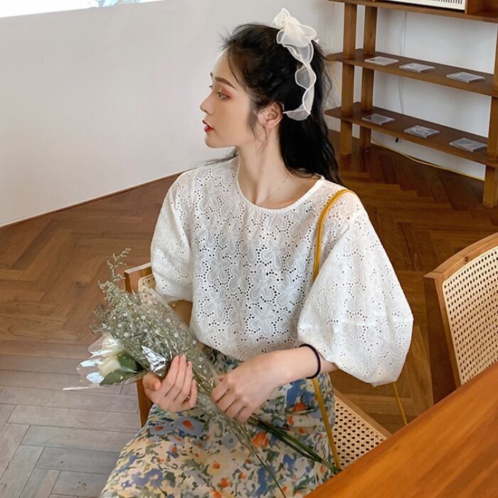 韓国風 ブラウス トップス 花柄 パンチングレース 半袖 パフスリーブ ボリューム袖 ラウンドネック 透け感 清楚 ガーリー かわいい デート 女子会 普段使い 春 夏 RB-A06-0104
