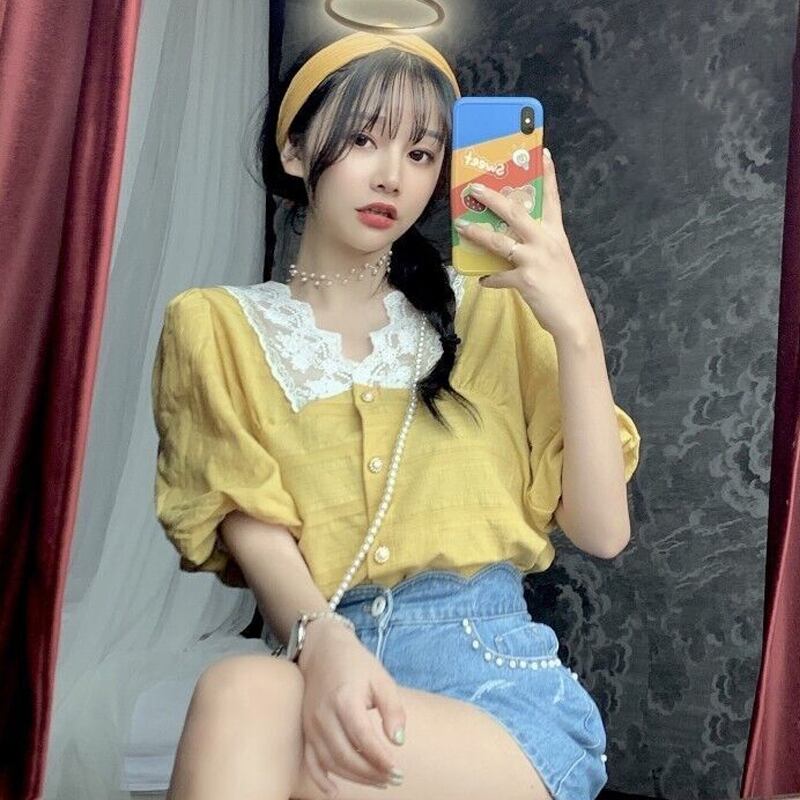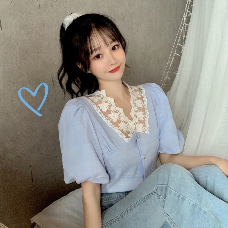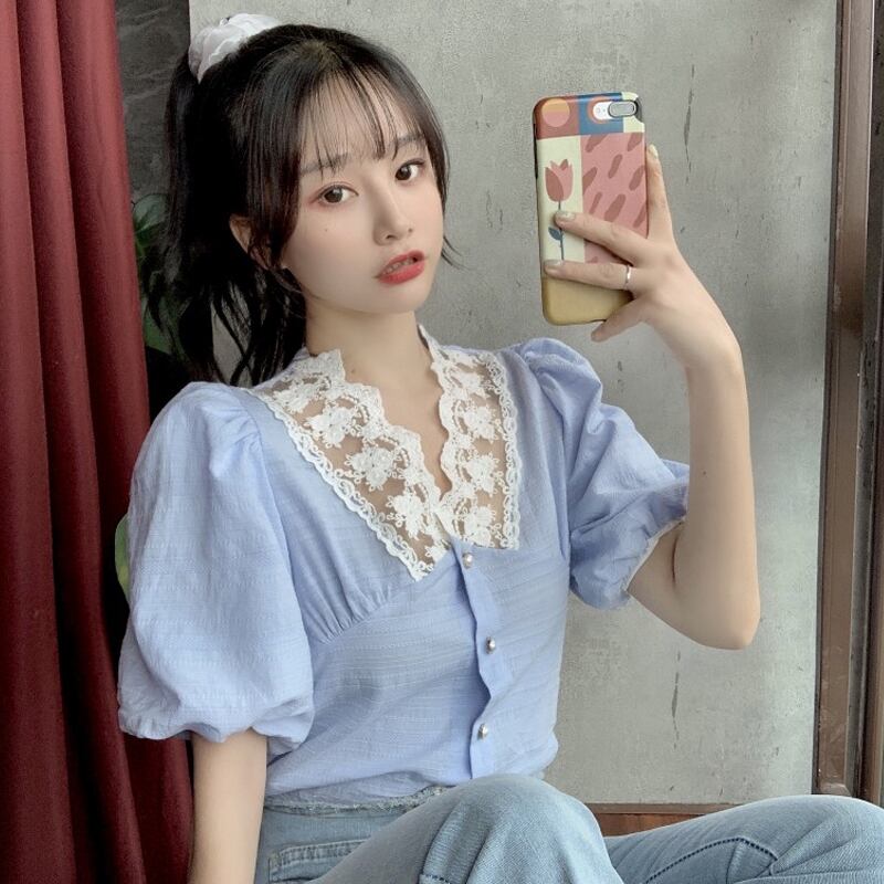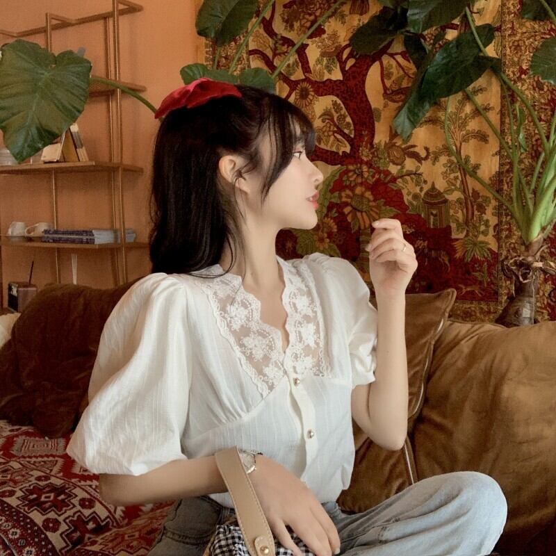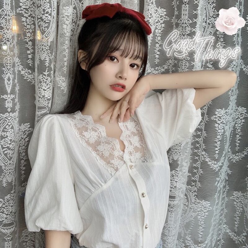 ブラウス トップス 半袖 パフスリーブ ボリューム袖 Vネック レース パールボタン きれいめ 上品 清楚 ガーリー かわいい お出かけ お呼ばれ デート 女子会 春 夏 RB-A06-0105