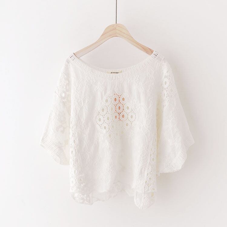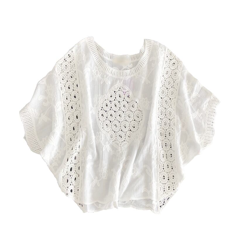 ブラウス シャツ レース 透かし模様 半袖 ドルマン ラウンドネック 透け感 ゆったり 通気性 ナチュラル ガーリー かわいい 清楚 お出かけ デート 女子会 普段使い 春 夏 RB-A06-0107