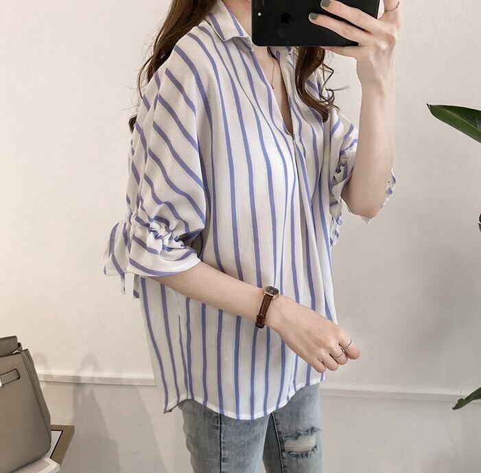 韓国風 シャツ 半袖 ストライプ柄 スキッパーシャツ 袖リボン ドルマンスリーブ ゆったり カジュアル リラックス 通勤 お出かけ 春 夏 RB-A06-0111