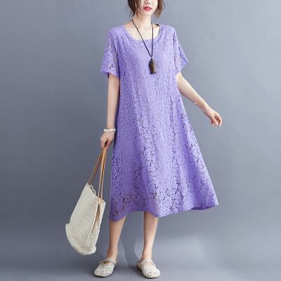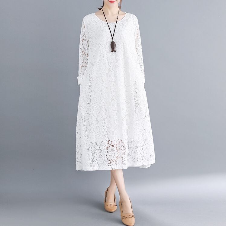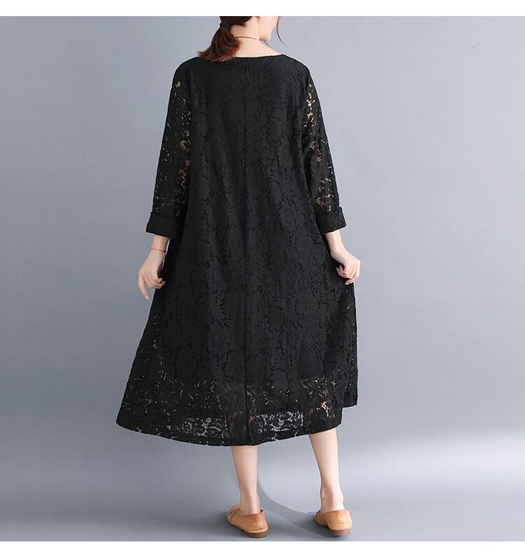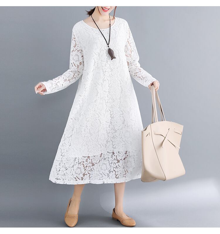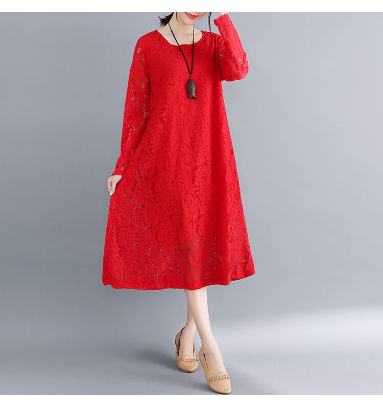 [7カラー]ワンピース 長袖 ラウンドネック レース ロング丈 ひざ下 透け感 大人 カジュアル 大きいサイズ ゆったり RB-M06-0087