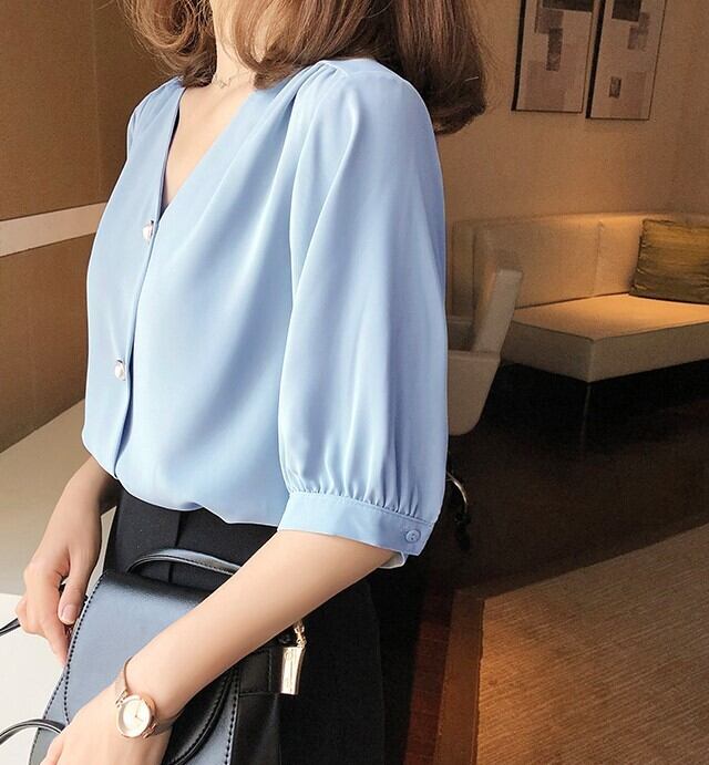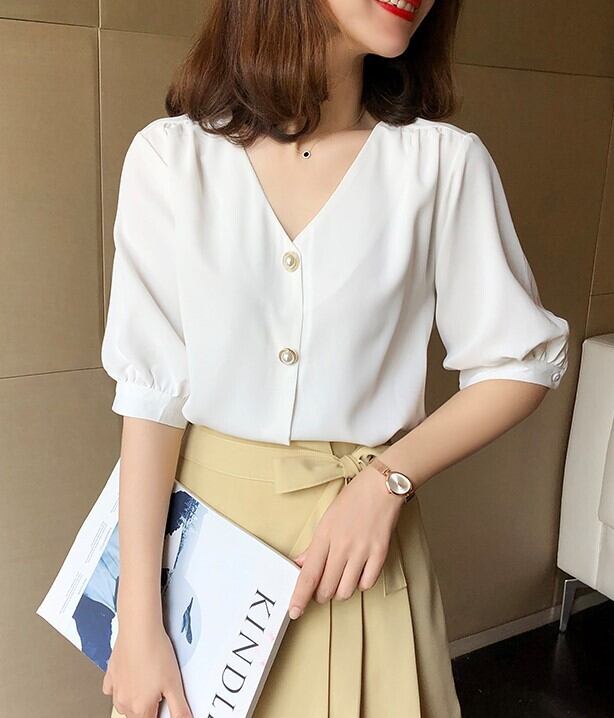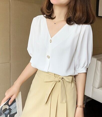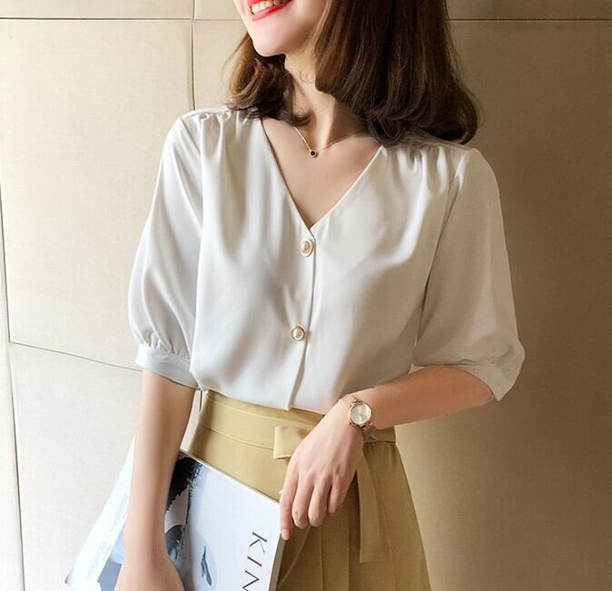 韓国風 ブラウス シャツ トップス 半袖 Vネック シフォン パールボタン 無地 上品 フェミニン きれいめ 大人かわいい 清楚 通勤 オフィス お呼ばれ デート 春 夏 RB-A06-0121